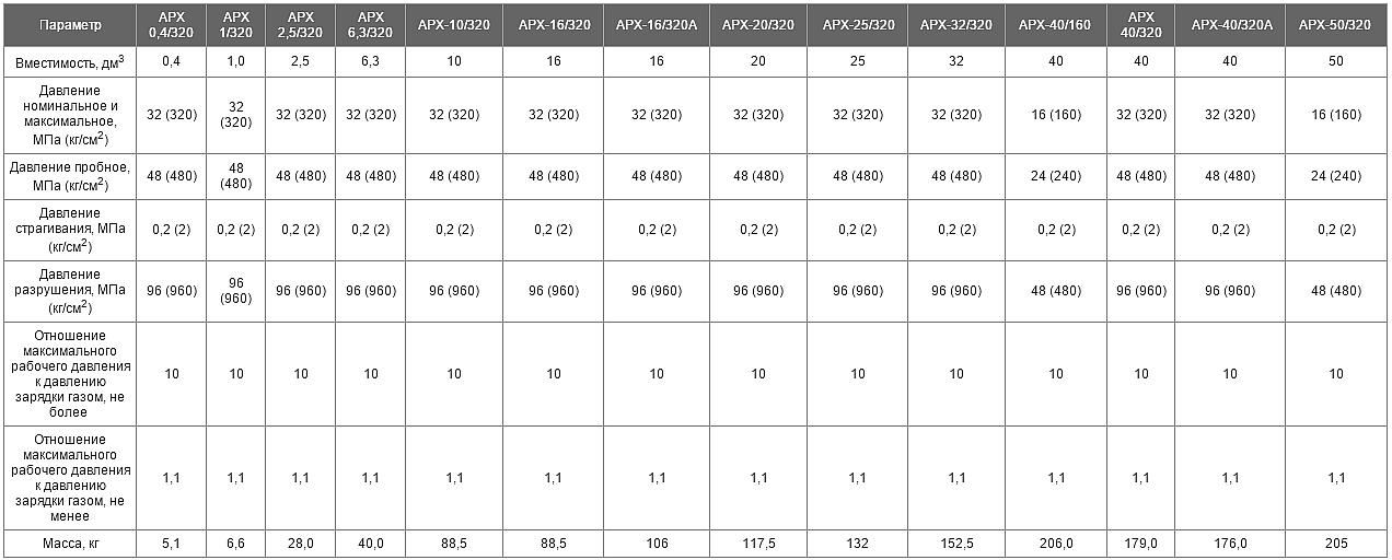 | Название | Вместимость, л | Номинальное давление, МПа | Габаритные размеры Ø x L | Резьба | Масса, кг |