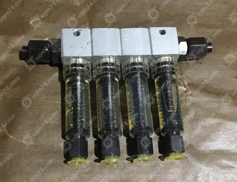 Модульные секции блока имеют указатель расхода масла и устройство плавной регулировки. Положение поплавка позволяет оценить расход смазочного материала. Регулируется расход путем поворачивания трубки отвода против часовой стрелки (расход уменьшается) или по часовой стрелке (расход увеличивается).