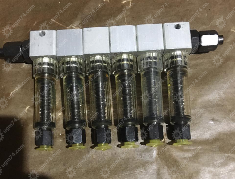 Модульные секции блока имеют указатель расхода масла и устройство плавной регулировки. Положение поплавка позволяет оценить расход смазочного материала. Регулируется расход путем поворачивания трубки отвода против часовой стрелки (расход уменьшается) или по часовой стрелке (расход увеличивается).